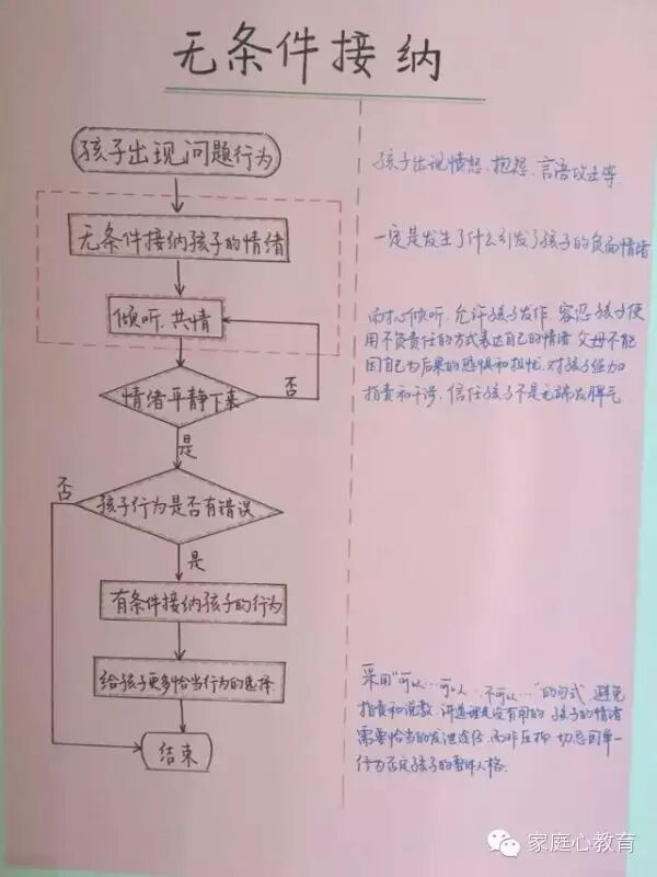 今天早上想跟大家分享的是无条件的接纳孩子。就像给大家发的这张图片一样,核心是亲情、倾听共情以及让孩子的情绪平和下来。这张图是一个老师转发的运用的非常清晰,希望大家能够认真看。在运用的过程中最重要的一个环节是要学会控制自己的情绪,要学会倾听,那么如果家长要想学会控制,要想影响孩子,核心是要学会控制自己的情绪。在控制情绪中,我们在课中谈的最常用的方法是微笑。 对家长来讲,能不能有效的控制自己的情绪,能不能跟孩子产生共情或倾听,那这就需要看家长平时的修为,或者平时对事情的影响。总之,这张图已经讲得很清晰,希望大家好好的运用。最重要的是大家在日常生活中要运用到。