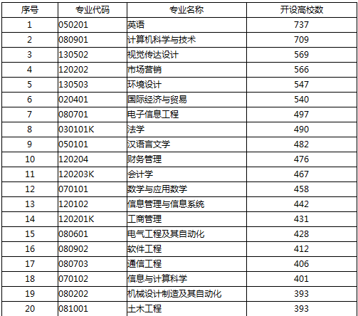 以下为中国本科专业开设高校数排行榜前20位专业。
