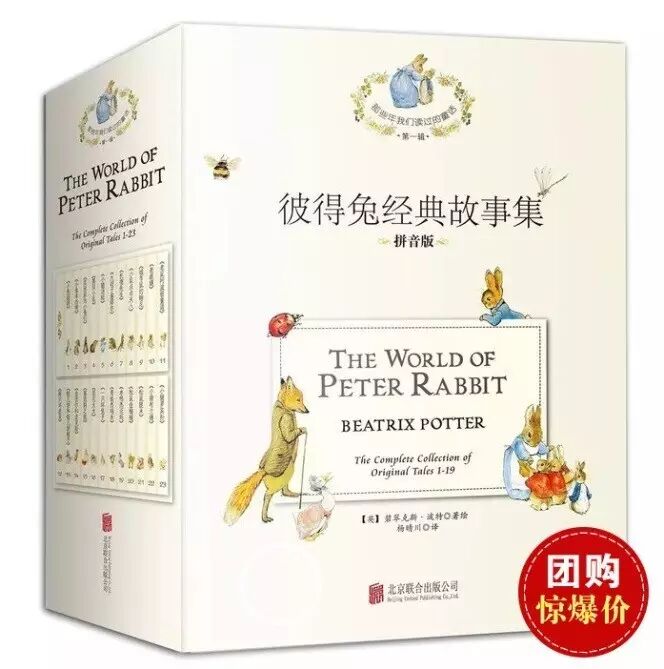 大人小孩子都爱的“彼得兔新版系列”来啦! [英] 碧翠克斯.波特著 杨晴川译 北京联合出版公司2015年8月出版 定价:243.2元 微书店劲爆团购价:145.8元(京东在售:186.5元) 整套全册19本,另赠送一套6册英语学习卡片哦!!! 彼得兔是谁呢? 《彼得兔的故事》(The Tale of Peter Rabbit)是世界童书史上销量第二大的童书,被美国《出版者周刊》称其为“所有时代的畅销童书”。从1902年第一个故事的发表到今天,年年印刷,版本无数,销售量以亿记。在英语国家里,几乎每一个小孩子都有过一套或几本《彼得兔》,被誉为儿童文学中的圣经。