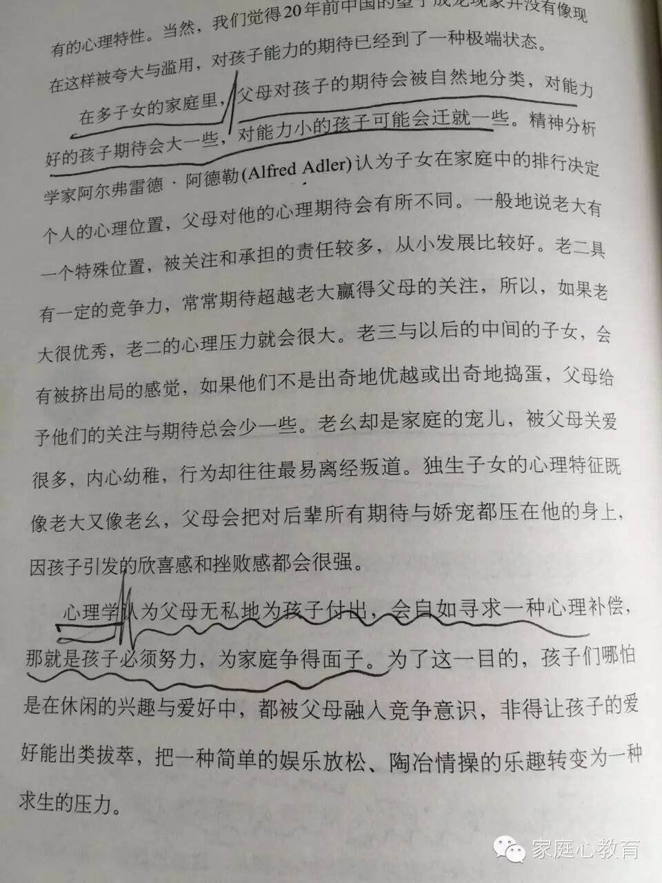 今天早上跟大家分享的主题是爱与控制。就像给发的书上那页,心理学认为:父母无私的为孩子付出,会自如寻求一种心理补偿,那就是孩子必须努力,为家庭争得面子。这是装在我们潜意识中的,我们很多家长可以在意识层面说,我不是这样子的,但是在潜意识中会认为有付出就一定要求对方有一定的回报,所以在家庭中就经常有这样的话,我都是为你好。那妈妈会说,我为了你好,所以你学音乐一定要坚持下去;我为了你好,你学围棋要坚持下去;我为你好,你一定要干什么干什么...... 这种语言和行为,其实就有父母对孩子的爱,演变成为了父母对孩子的控制,也就是说,在心理学上所说的有条件的爱。它在潜意识的意思就是你不好好吃饭我就不爱你,你不好好学习我就不爱你,你不听话我就不爱你,就变成了一种控制。换句话来讲,就是对孩子充满了期待。孩子在这种家庭氛围中成长起来的时候,内心没有力量。他总感觉妈妈的那种声音无所不在,一直到他终年老去。那怎么样,我们才能从一个有条件的爱变成无条件的爱呢? 昨天我的孩子在厕所里拉粑粑的时候,他拉着妈妈的手说了句话:妈妈不管你对我怎么样,我都爱你。这是孩子的声音,其实孩子的这句话很好描述了什么是爱。什么是爱?我再重复一遍:不管你对我怎么样,我都爱你。孩子的声音是来自于灵性,来自天地之气,是最真实最真诚的声音。也就是说无条件的爱就是对孩子所有行为没有期待和要求。反过来是一样的,爸爸妈妈也可以这样去表达。如果你想引导孩子的行为,你需要把自己的情绪表达出来。 你可以说妈妈很忙,妈妈很着急,妈妈希望你快点。当然,不管你忙还是不忙,妈妈都爱你。或者说妈妈自己就因为没有自制力,所以妈妈希望你有自制力,能够持之以恒的学习下去。学习围棋、学习音乐、学习钢琴、学习舞蹈,慢慢希望你这样做。当然,不管你做什么样的选择,妈妈都爱你。把爱与行为、期待区分开,做一个无条件的爱,那么注意父母要学会爱,而不是学会控制孩子。 总结:把爱与行为、期待区分开,做一个无条件的爱,那么注意父母要学会爱,而不是学会控制孩子。