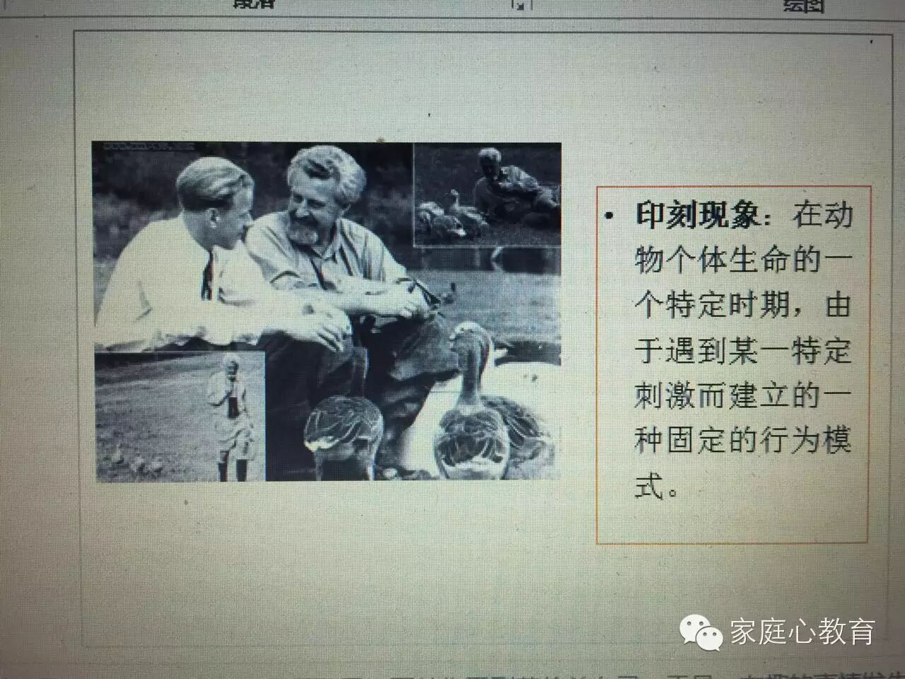 今天跟大家分享的主题是在心理学中很有趣的一个现象叫印刻现象,就想给大家发的那张图一样。大家会看到这是劳伦兹在进行这项实验时得出了一个结论:他说在动物个体生命的一个特定时期,由于遇到某一个特定刺激而建立的一种固定的行为模式。那么劳伦兹再进行这项实验的时候,他让刚刚破壳而出的小鸭子不先看到母鸭子,而先看到劳伦兹自己,于是有趣的事情就发生 了:劳伦兹在小鸭子面前走过的时候,后面就跟随着几只小鸭子,这小鸭子子把她当成母亲。 后来他进一步研究发现小鸡小鸟,以及病人之间母亲印刻,都是这样实行的,而且这种现象在其他哺乳动物上也有所发现。一般小鸡小鸭的母亲印刻发生期在十到十六小时;小狗的母亲印刻 观念期发生在三到七周,而且他发现动物在观念期不仅对自己的妈妈发生母亲印刻,而且对自己妈妈在小动物出生不久就离开的话也可能对其它动物发生母亲印刻。这就是为什么小鸭子会追随劳伦斯的原因。他从这儿进一步得出一个结论:如果人类婴儿出生过后,妈妈在关键时期没有陪伴孩子,那接下来,孩子可能对别的人或者其他的物体会产生母亲印刻的现象。那么这个再 进一步发展出来的就叫依恋理论。 那么从这个母亲印刻也就给我们得出很多结论,也就我们说的那个叫生母不如养母。在孩子成长的关键期的时候,母亲对孩子表达最好的爱就是陪伴,让孩子在婴儿期接受到母亲的这种印象 形成了母亲印刻。那么大家会看到孩子在这一生中就会跟母亲产生很好的连接。反过来,如果在孩子婴儿期这个阶段,母亲因为各种原因离开孩子,就会导致孩子对母亲没有这种母亲印刻, 形成一生的遗憾。 所以给大家的启发就是:在这个母亲印刻这个实验中告诉大家,生母不如养母,对孩子最好的爱就是陪伴。反过来,孩子在遇到困难或者困惑的环境或者某一个时刻的时候,如果有一个好的母亲印刻,那么首先想到的就是自己的母亲。那同样孩子在上园的这个过程中,他会跟自己的母亲产生分离,进而会产生焦虑。这就告诉大家分离焦虑是正常的一个现象,那对大家来讲,要好好地陪伴孩子哟。