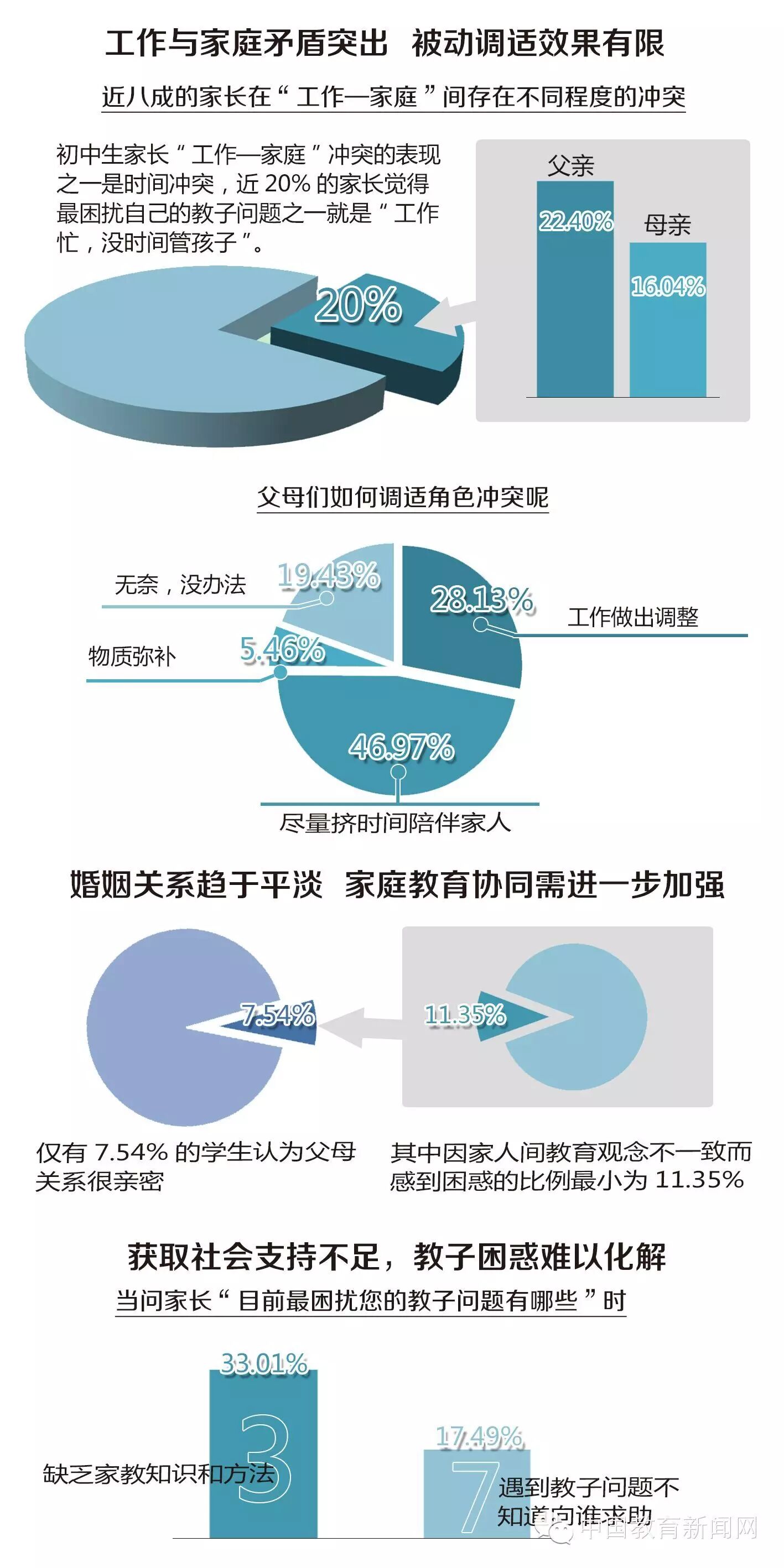 初中生家长“工作—家庭”冲突的表现之一是时间冲突,近20%的家长觉得最困扰自己的教子问题之一就是“工作忙,没时间管孩子”。