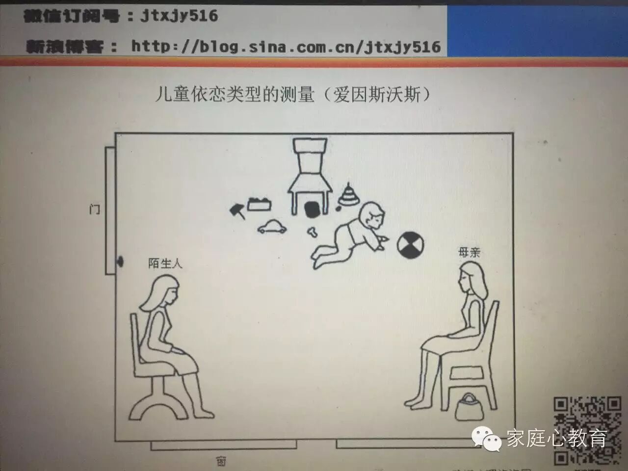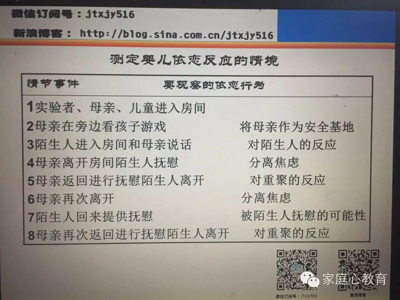 今天跟大家分享的是依恋的几种类型。在恒河猴实验的基础上,心理学家爱因斯沃斯,做了另外一个测量就是儿童依恋的类型。就像给大家发那个图一样,大家会看到把实验者也就是陌生人,妈妈和儿童在相对封闭的一个房间。然后让他做了接下来的几个步骤:妈妈在旁边看孩子怎么玩儿游戏,这时候孩子能不能把妈妈当成安全基地;然后了陌生人进入房间和妈妈说话,看在玩耍中的孩子对陌生的反应;第四个步骤是妈妈离开房间的时候,陌生人进行安慰孩子的分离焦虑会出现什么现象。 然后第五个步骤,母亲重返进行安慰陌生人离开对重聚的反应;然后母亲再次离开看孩子的分离焦虑;第七、陌生人回来提供抚慰。第八个步骤,母亲再次返回进行安慰,陌生人离开。后来这个心理学家发现有这样三种明显的孩子。第一种孩子是安全依恋型孩子。他出现的现象是母亲在身旁的时候通常孩子会把母亲作为探索外在世界的安全基地,也就是有安全感。他在玩耍时不时地回到母亲身边寻求安慰,通常他们也比较合作,陌生人来到现场过后,他比较友善。安全型的孩子一般比较快乐和自信,在幼儿园里面有极强的自信能力。母亲再次回来的时候呢,跟母亲有良好的互动。 第二种类型的孩子叫焦虑矛盾型孩子,也有把他叫回避型的孩子。焦虑矛盾型的孩子,她在母亲离开之前就比较焦虑,紧张的关注母亲的行为生怕母亲会离开,因此他玩耍的时候不能百分之百的投入。第二个母亲离开过后,她们更加不安,跟陌生没法相处,特别是当母亲回来之后,他们的行为表现得很矛盾。一方面想跟母亲亲近,另一方面已经打击来拒绝。那么这样的孩子很难对周围的环境进行探索,很难安抚,对陌生人非常不友好。妈妈对孩子的需求也不是特别关心和敏感。 还有一种孩子叫冷淡,有的把他称为挑战型的这种儿童。这种在妈妈离开时候很少哭泣,母亲返回是他们不太高兴,并且会想办法逃避母亲。这种孩子在需要时不会寻求帮助,经常有愤怒的情绪,对陌生人不是特别在意。就是这样三种类型非常明显,那么这三种类型的孩子究竟是怎么形成的?那就是明天要跟大家分享的课程内容,最终还是要提醒大家的是:孩子养成了一个良好的依恋理论是他一生的幸福。如果孩子在没有良好的依恋理论会觉得妈妈不喜欢他,所有人都不喜欢他,所以是一辈子的痛苦。各位家长早安!