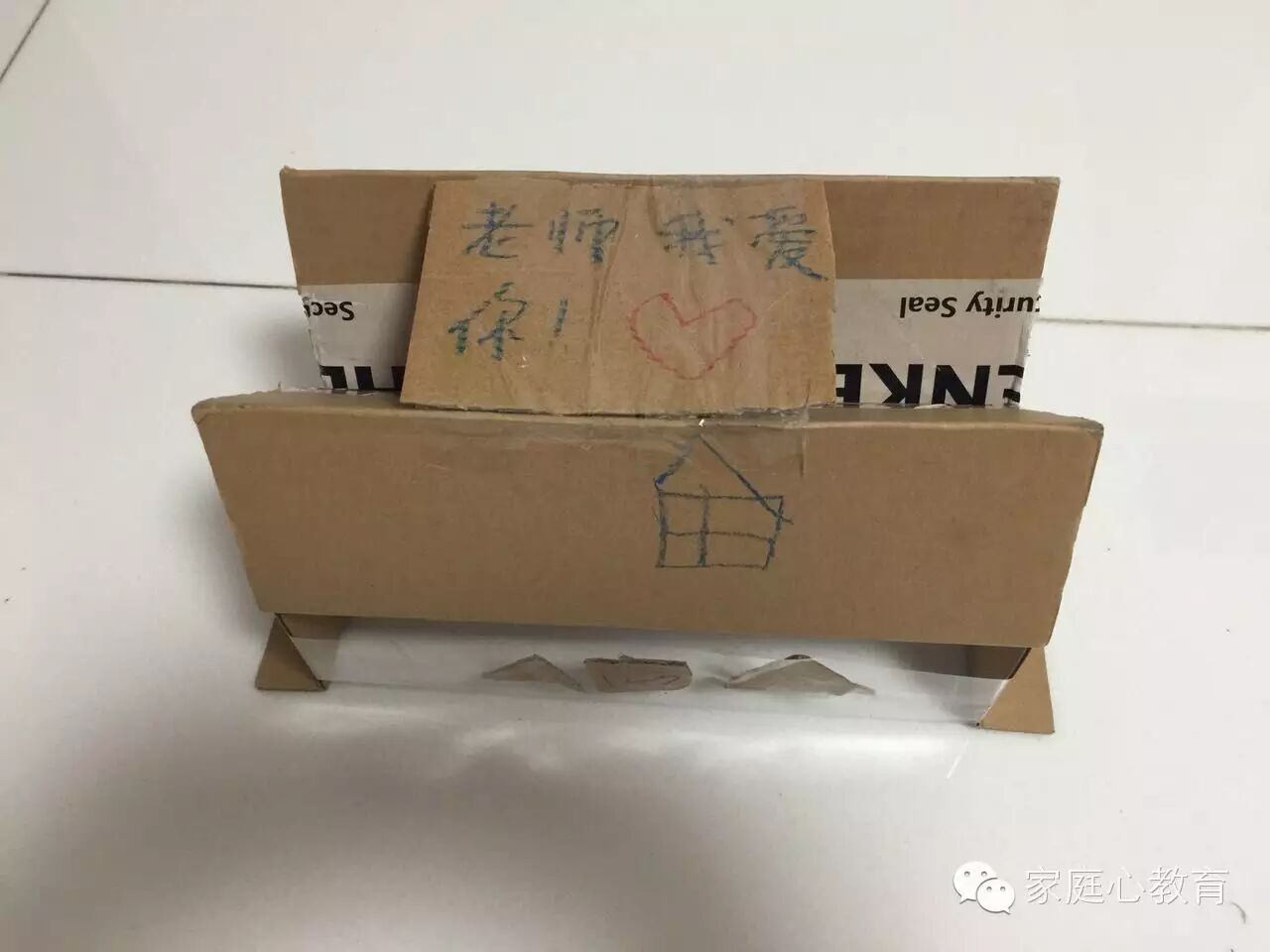 今天想跟大家分享的主题是从孩子的角度去看待爱。今天是教师节,昨天晚上孩子在小区里玩了回来过后,就跟我们讲要给老师制作一个礼物。然后我们也不知道他制作什么?我们就说你自己做吧!然后就做了些,就是发给大家最后一张图片:用一个快递废纸盒做的一个礼物。那么在这个礼物上呢,做的时候我就问他,这是什么呢?他说这是一个房子,我说那你这个房子是要做什么呢?他说送给老师住。为什么要送给老师住?担心老师感冒和生病,然后说我爱老师。 其实在他制作的过程中,我一直在担心老师并不是喜欢这种礼物?我想引导他说,我们给老师做一朵花好不好?孩子说:“不,我就要给他做礼物。”在这个过程中我为什么想去引导他担心老师不喜欢,这就是我们平时讲的对未来的恐惧。那同时在做这礼物过程中,我总觉得这个礼物是孩子们喜欢,但是对老师来讲是不是反而觉得不喜欢了?这也是我另外担心的地方,还有就是我觉得去送人礼物最好的是鲜花,表达爱和情感。如果用这种废报纸废纸盒去做的,我总觉得老师会不会感觉孩子是在敷衍他。 后来孩子做完了过后,然后让我在上面写了几个字说:老师我爱你。他自己画的红心表达出他对老师真正的爱。真正要做完了昨天晚上睡觉的时候,还特意说今天早上一定要带上。然后今天扛着这个礼物去了幼儿园,发现老师其实很喜欢。从这件事上我就感觉到我们家长不自觉的会有很多恐惧。其实在孩子的世界来谈爱的时候,就是当下、简单、直接。真正的爱是只有爱,没有目的,没有功利心,当然也没有恐惧。希望我们家长都能从孩子身上学习到什么是爱,推广到爱我们身边的人。