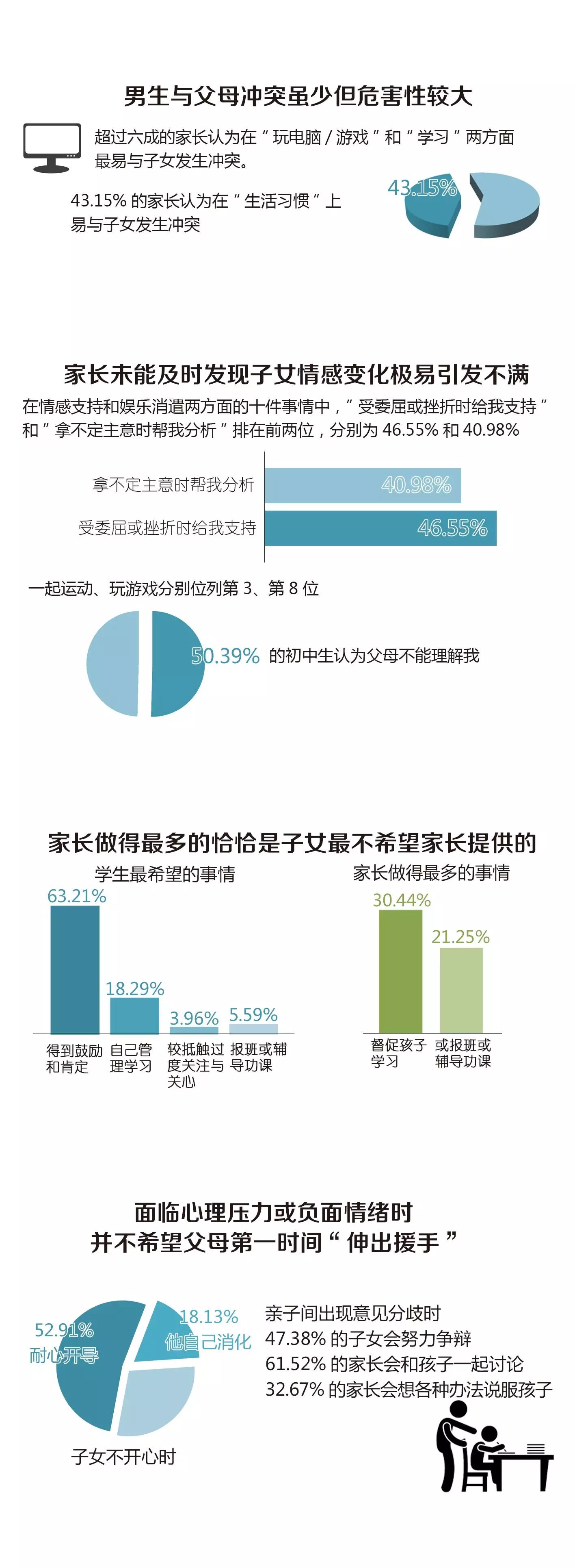 初中生亲子冲突呈现出三大特点: 涉及面广,几乎涉及初中生生活的每个方面,其中超过六成的家长认为在“玩电脑/游戏”和“学习”两方面最易与子女发生冲突,43.15%的家长认为在“生活习惯”上易与子女发生冲突。 女生更易与父母发生正面冲突,常见九个方面的亲子冲突中,女生有七项的比例均高于男生,其中由家务、偶像崇拜所引发的亲子冲突最为突出。女生与父母主要是外显、频繁的言语冲突,男生则以较为内隐、以消极抵抗的亲子冲突为主。女生的冲突更易被亲子双方所感知,也更易获得相互了解与解决的机会,其危害性反而相对较小。 母亲更易和子女发生冲突。九项亲子冲突原因中,母亲有五项数据的比例均高于父亲,其中母亲与子女在学习、生活习惯上的冲突最为突出。 初中生亲子关系还有显著的阶段性特点。随着年龄增加和自我意识及私领域意识的增强,初中生在学习、交友、花钱、隐私、偶像崇拜等“个人选择”方面更易与家长产生矛盾;而随着是非判断能力增强,对生活习惯、上网娱乐等“原则性问题”有了客观认知,能逐渐认同父母的是非评判,意识到父母言之有理,在这方面产生亲子冲突的比例呈持续下降趋势。
